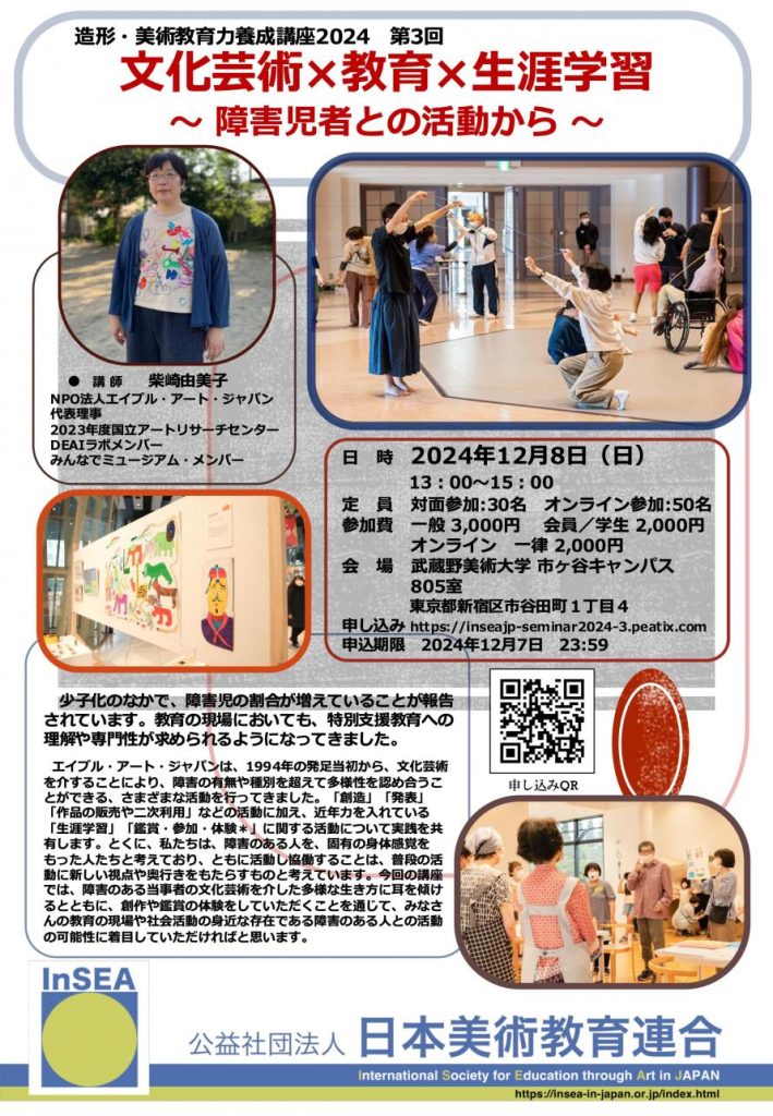 エイブル・アート・ジャパンは、1994年の発足当初から、文化芸術を介することにより、障害の有無や種別を超えて多様性を認め合うことができる、さまざまな活動を行ってきました。「創造」「発表」「作品の販売や二次利用」などの活動に加え、近年力を入れている「生涯学習」「鑑賞・参加・体験*」に関する活動について実践を共有します。とくに、私たちは、障害のある人を、固有の身体感覚をもった人たちと考えており、ともに活動し協働することは、普段の活動に新しい視点や奥行きをもたらすものと考えています。今回の講座では、障害のある当事者の文化芸術を介した多様な生き方に耳を傾けるとともに、創作や鑑賞の体験をしていただくことを通じて、みなさんの教育の現場や社会活動の身近な存在である障害のある人との活動の可能性に着目していただければと思います。