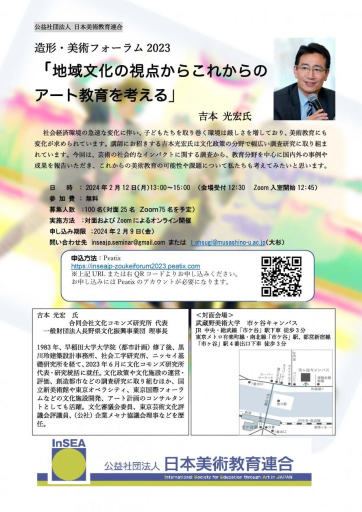 社会経済環境の急速な変化に伴い、子どもたちを取り巻く環境は厳しさを増しており、美術教育にも変化が求められています。講師にお招きする吉本光宏氏は文化政策の分野で幅広い調査研究に取り組まれています。今回は、芸術の社会的なインパクトに関する調査から、教育分野を中心に国内外の事例や成果を報告いただき、これからの美術教育の可能性や課題について私たちも考えてみたいと思います。