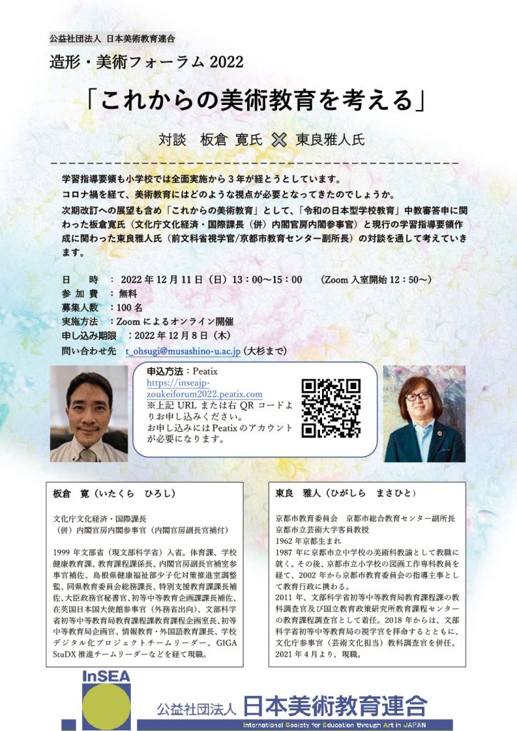 次期改訂への展望も含め「これからの美術教育」として、「令和の日本型学校教育」中教審答申に関わった板倉寛氏(文化庁文化経済・国際課長/併 内閣官房内閣参事官)と現行の学習指導要領作成に関わった東良雅人氏(前文科省視学官/京都市教育センター副所長)の対談を通して考えていきます。